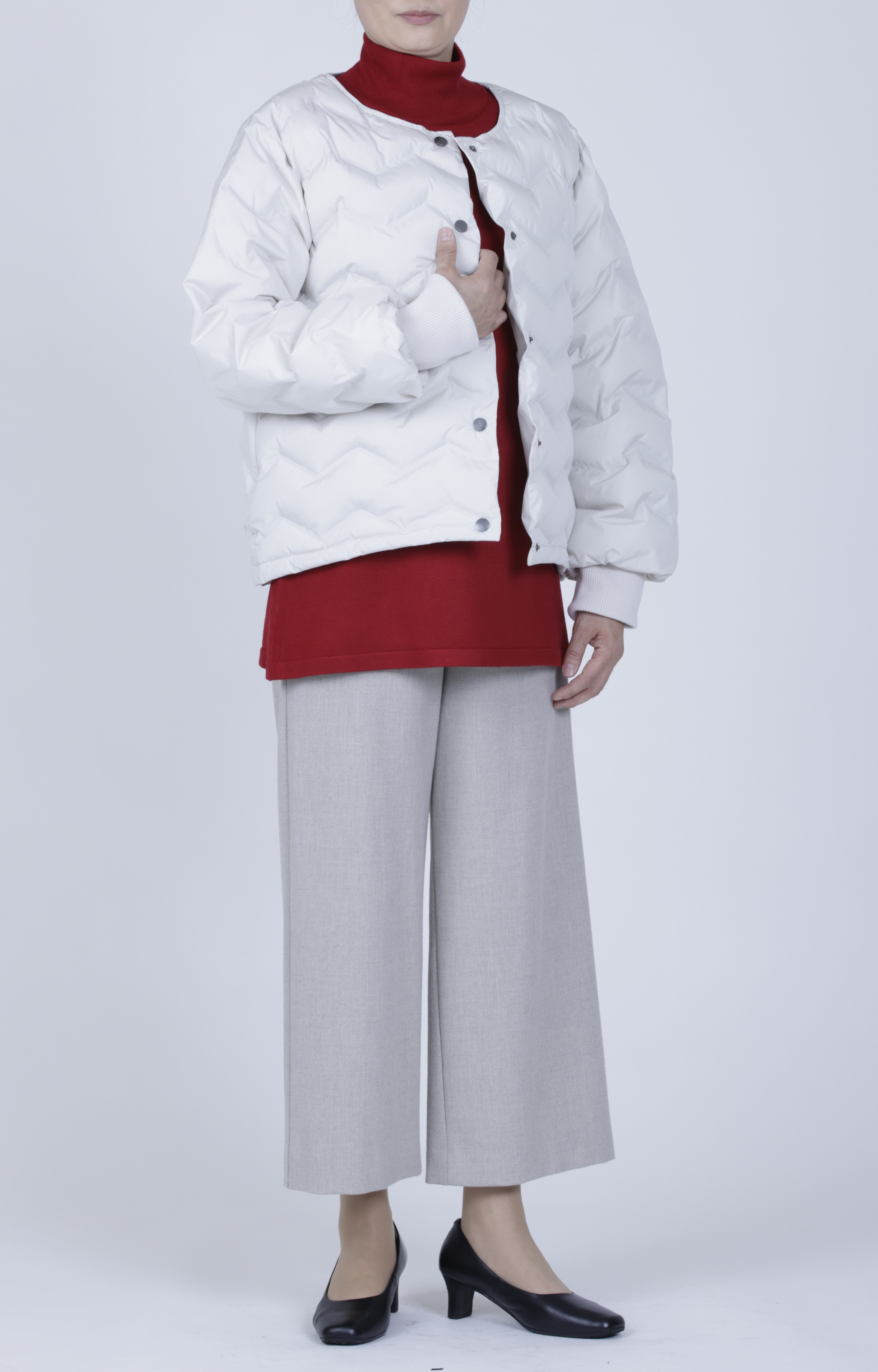 - ノーカラーデザインで顔周りをすっきりと見せ、大人っぽい印象に。