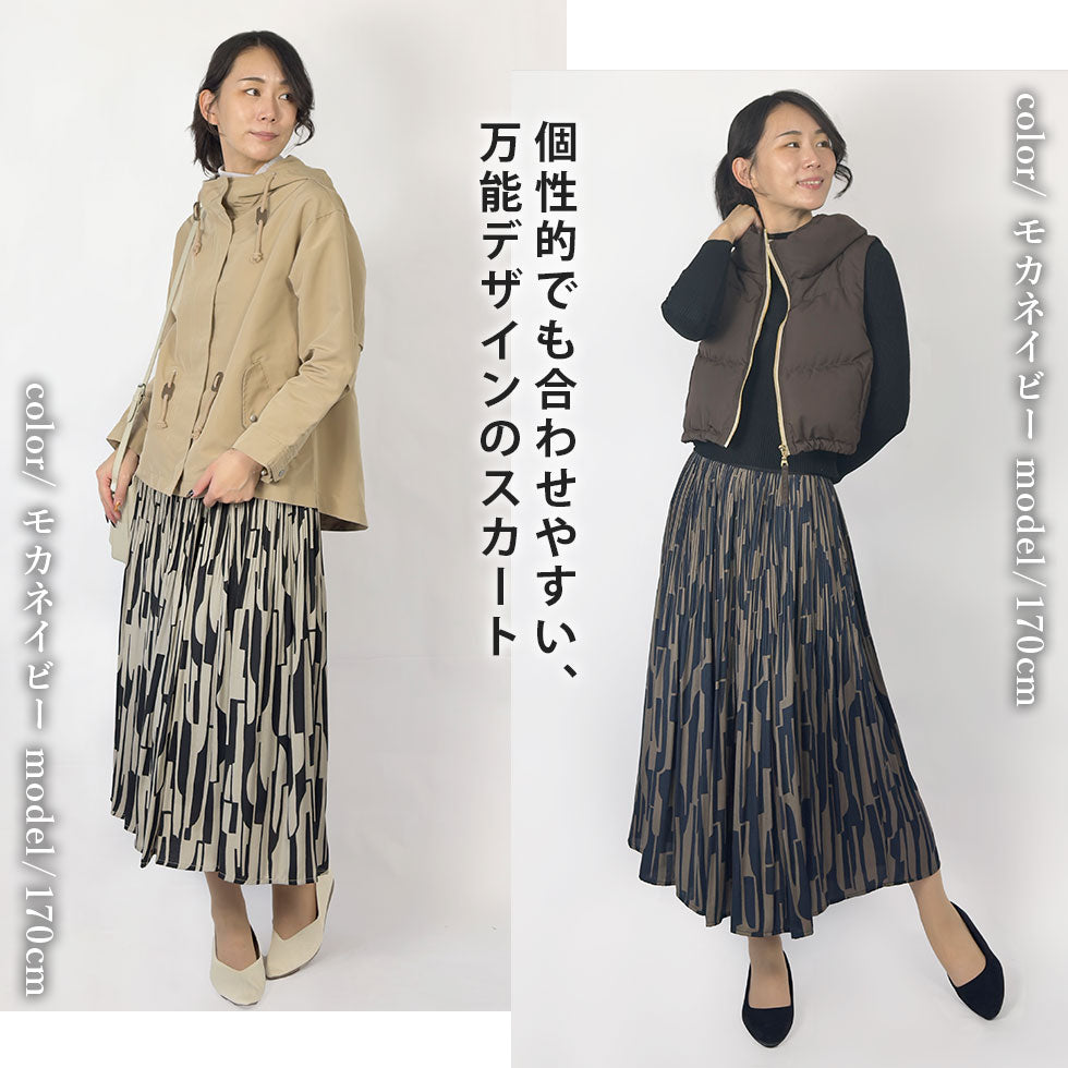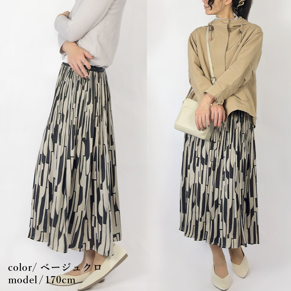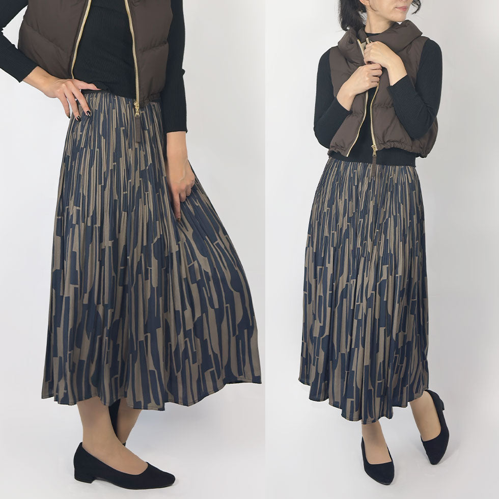 膝上まで入ったプリーツ加工と、縦に流れる幾何学模様が相まって、自然とスタイルアップして見える計算されたデザイン。裾に向かって広がるフレアシルエットは動くたびに美しく揺れ、華やかさと軽やかさを両立しています。重たく見えない程よい分量感で、細部までこだわりを感じる一枚です。