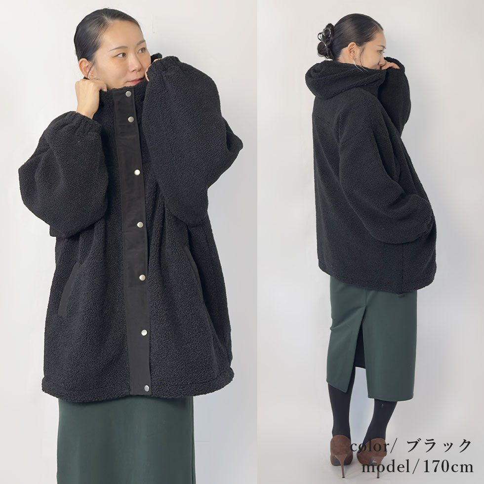 軽やかに暖かさを纏える、オーバーサイズフード付きボアジャケット。