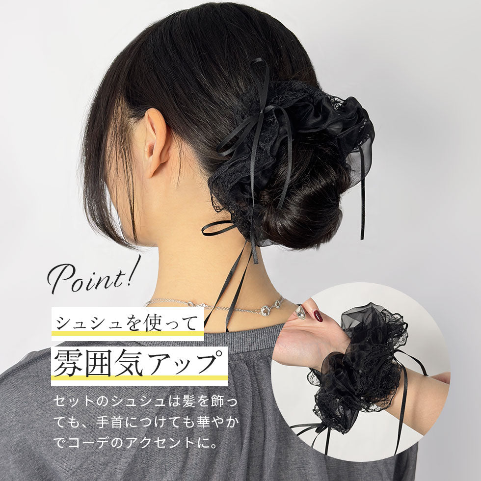 黒ベースなので、スカート、デニム、ワイドパンツなどアイテムを選ばずに合わせやすいのがポイント。カジュアルにスニーカー合わせはもちろん、スラックスやヒールを合わせればきれいめにも。かしこまった場でも浮かず、デイリーから特別な日まで使える幅広い対応力が魅力です。付属のシュシュを髪に結んだり手元に添えれば、統一感のあるコーデが完成します。