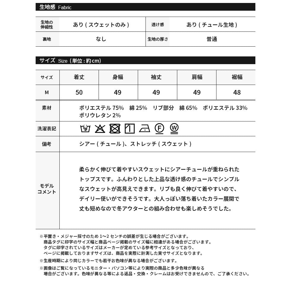 シアーの透け感とスウェットの気軽さが魅力のトップス。