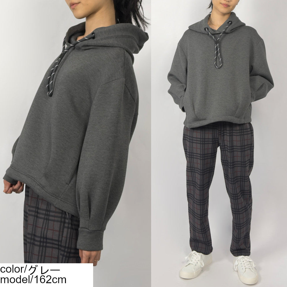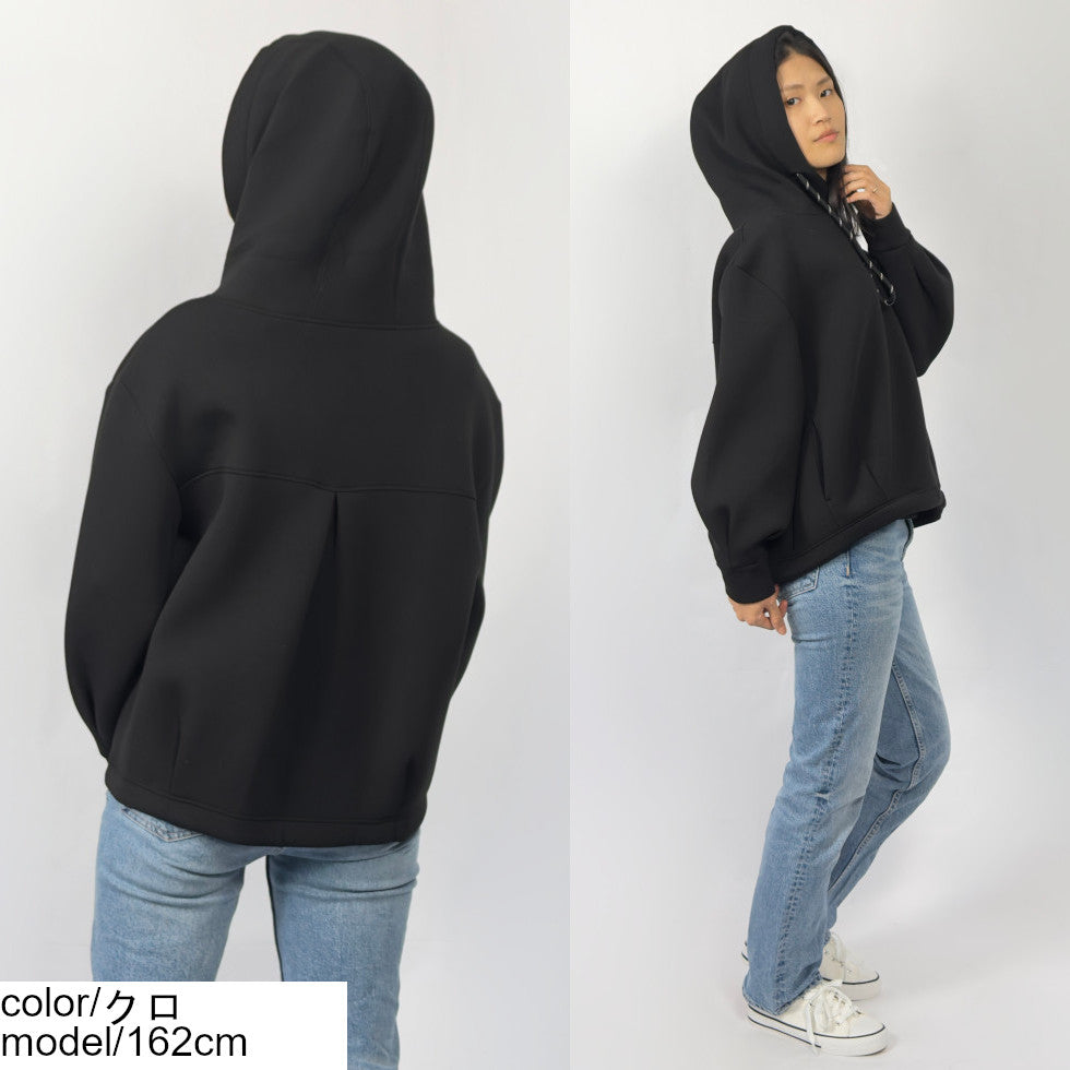 袖やボディに入ったタックが立体感を生み、シルエットを美しく演出。ショート丈で着ぶくれ感がなく、ボリュームのあるフードが小顔効果も叶えます。裏起毛ではないさらりとした質感なので、秋冬の重ね着にも便利です。