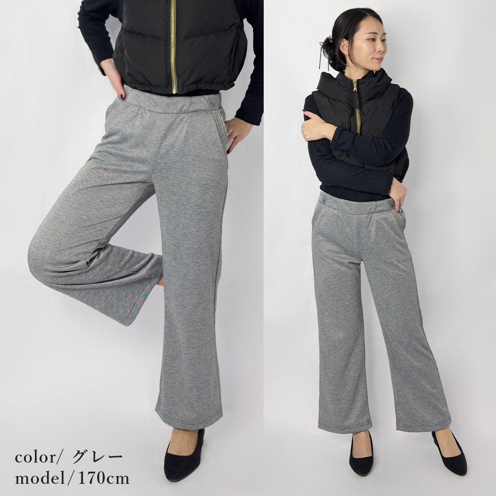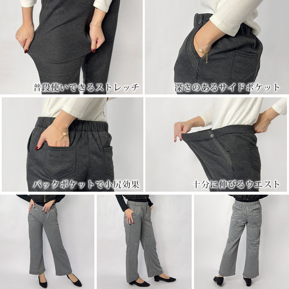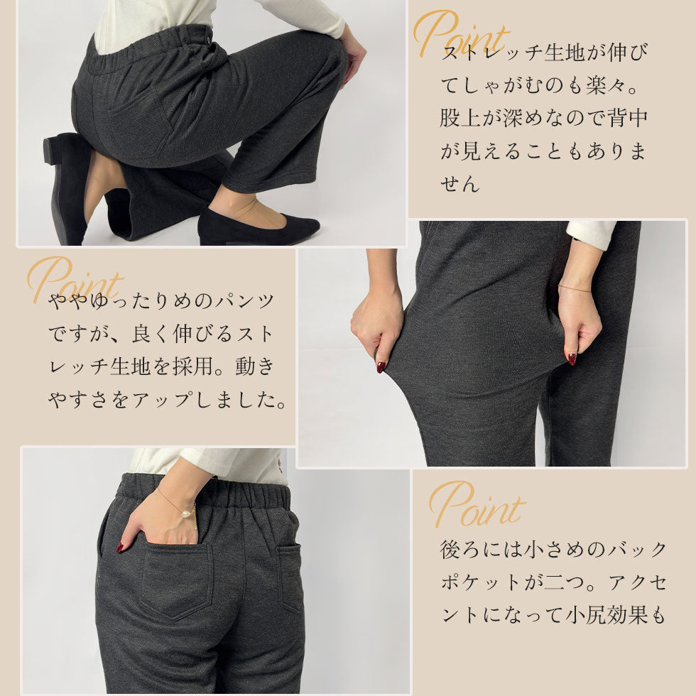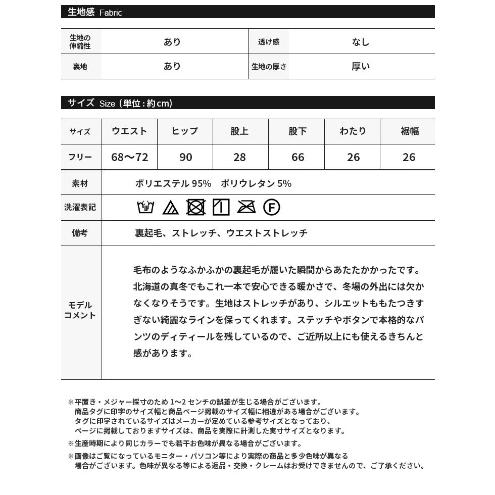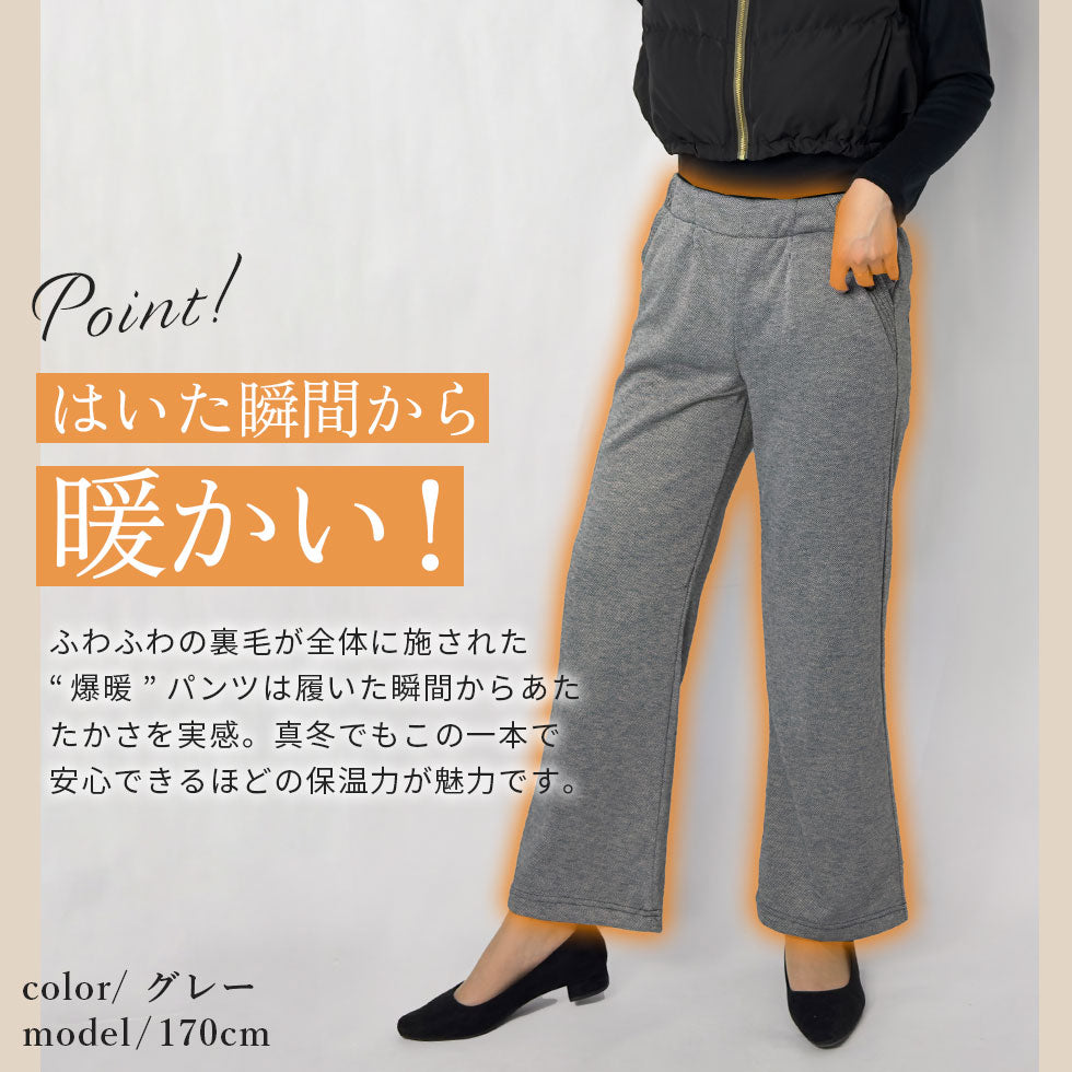 裏側には毛布のようにふかふかの裏起毛を採用し、履いた瞬間からあたたかさを実感できる“爆暖”仕様。真冬でもこの一本で安心できるほどの保温力が魅力です。深めの股上設計でしゃがんでも背中が見えにくく、普段使いにもストレスフリー。ほどよく効いたストレッチ性で動きやすさも抜群です。ラインはすっきりと美しく、カジュアルすぎず上品に着こなせます。