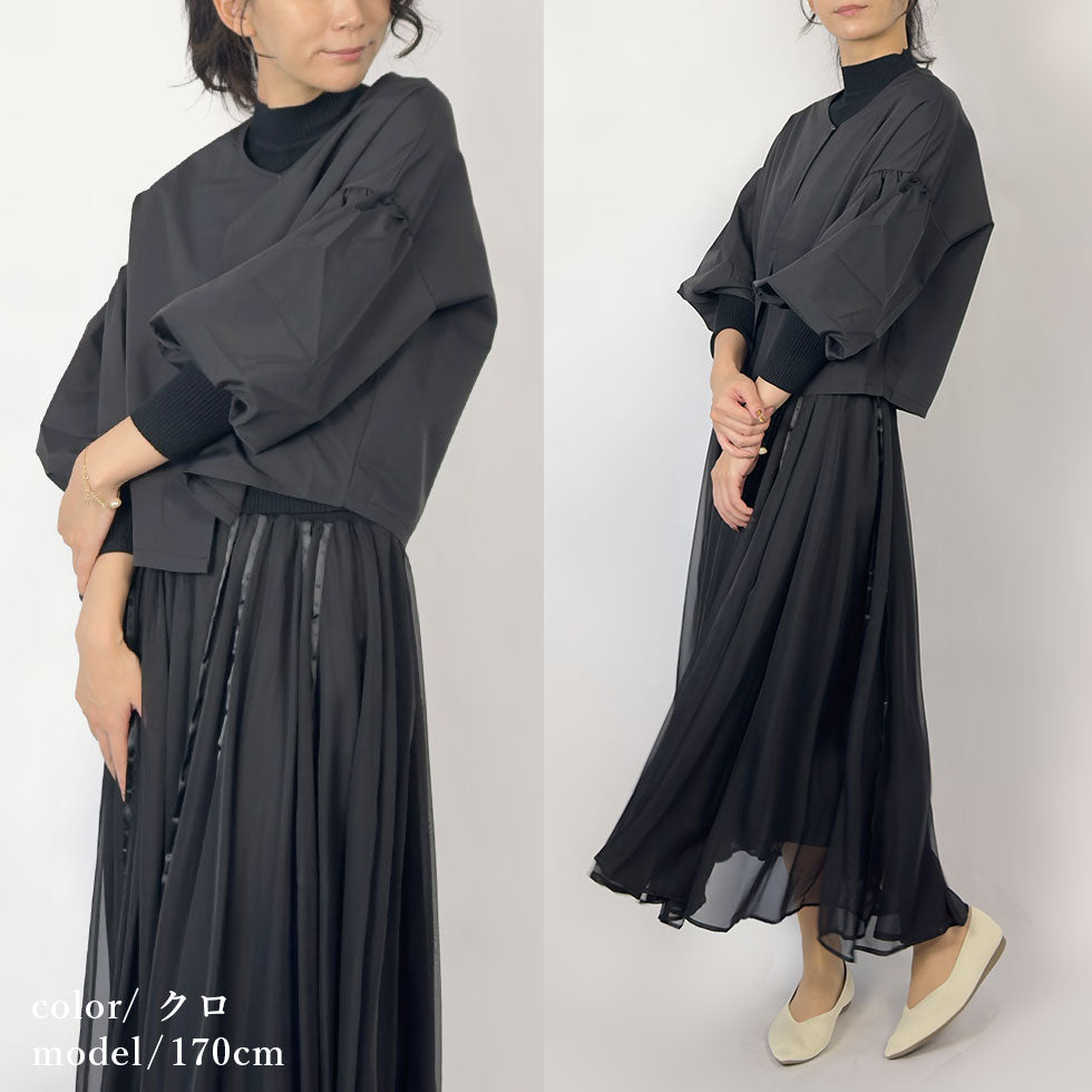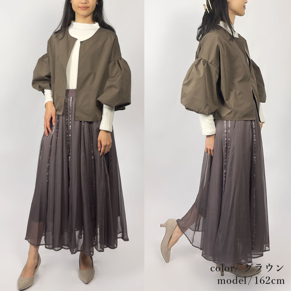 軽やかで上品。雨の日にも活躍するバルーンスリーブノーカラージャケット。