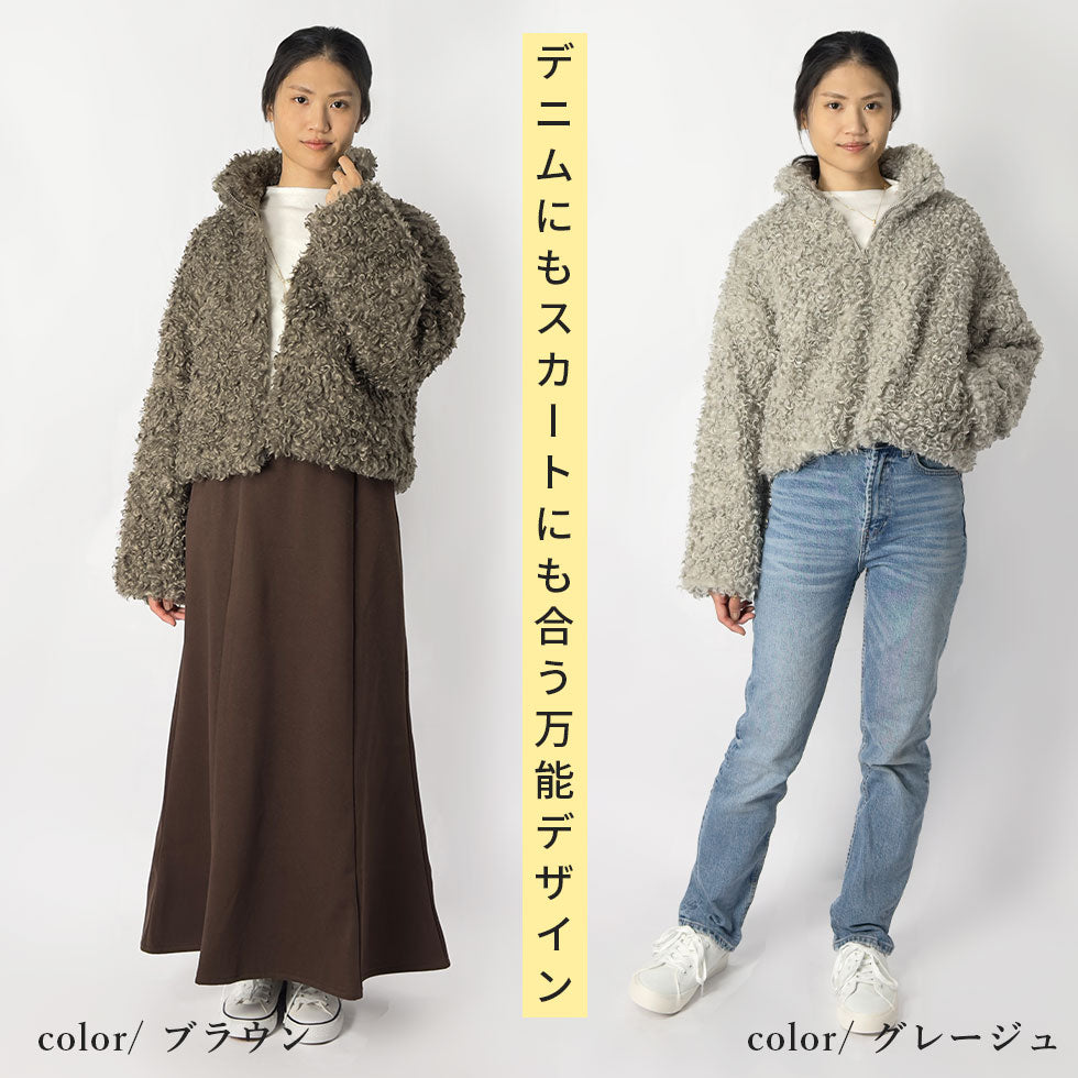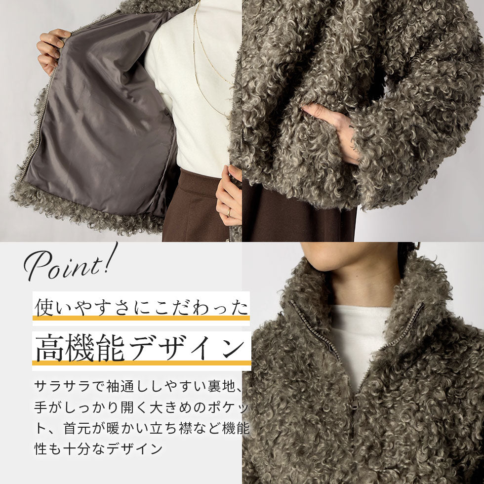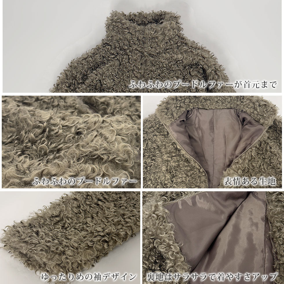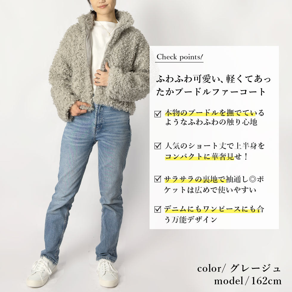 まるで本物のプードルを撫でているような、ふんわり柔らかな手触りが魅力のショートコートです。見た目の高級感とは裏腹に、とても軽くて着心地がラクなのが嬉しいポイント。裏地はサラッとした素材でニットの上からも着やすく、保温性も十分で真冬までしっかり活躍します。