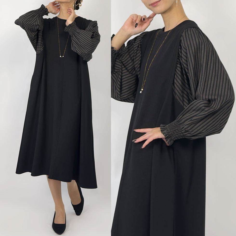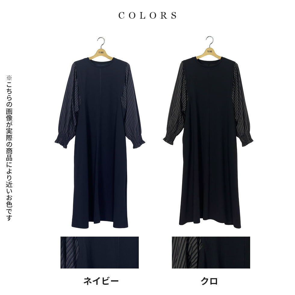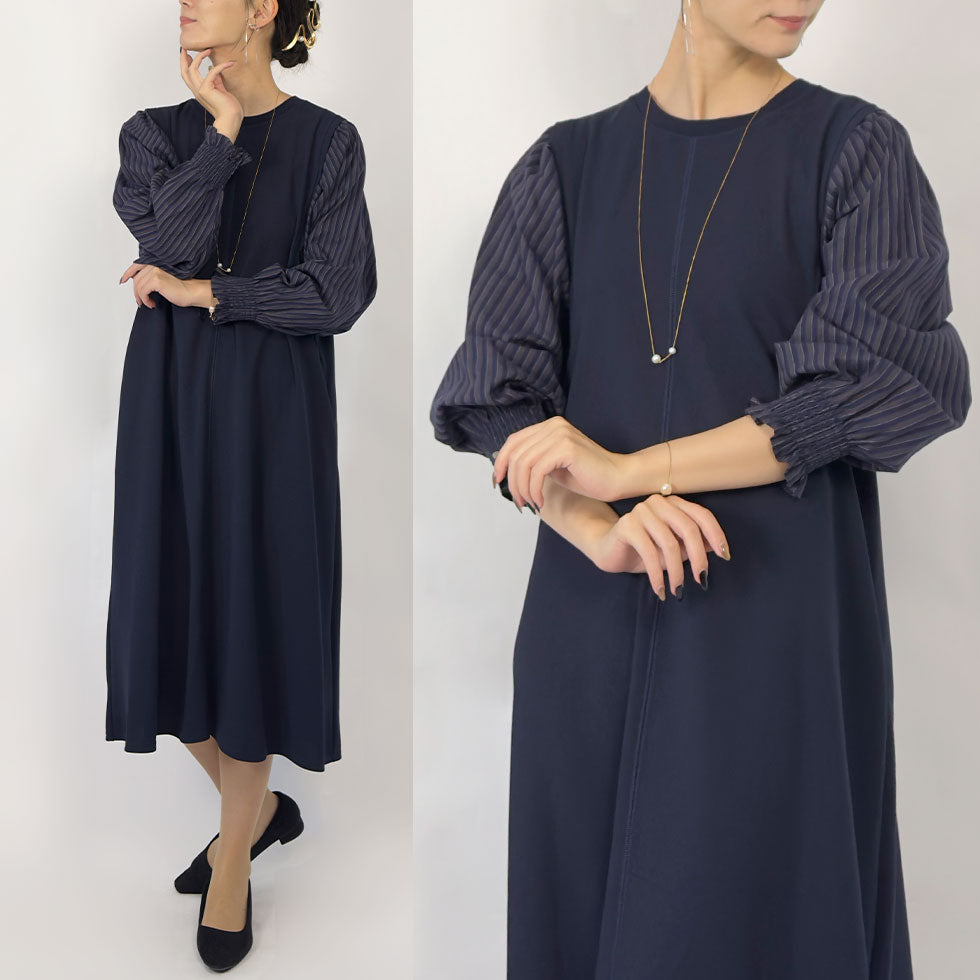 ボーダー柄のぽわん袖が大人可愛い印象を添えるワンピースです。ワンピース本体と袖部分に異素材を使用しており、レイヤードしているような雰囲気が一枚で完成。全体にストレッチが効いているため動きやすく、着心地の良さも魅力です。