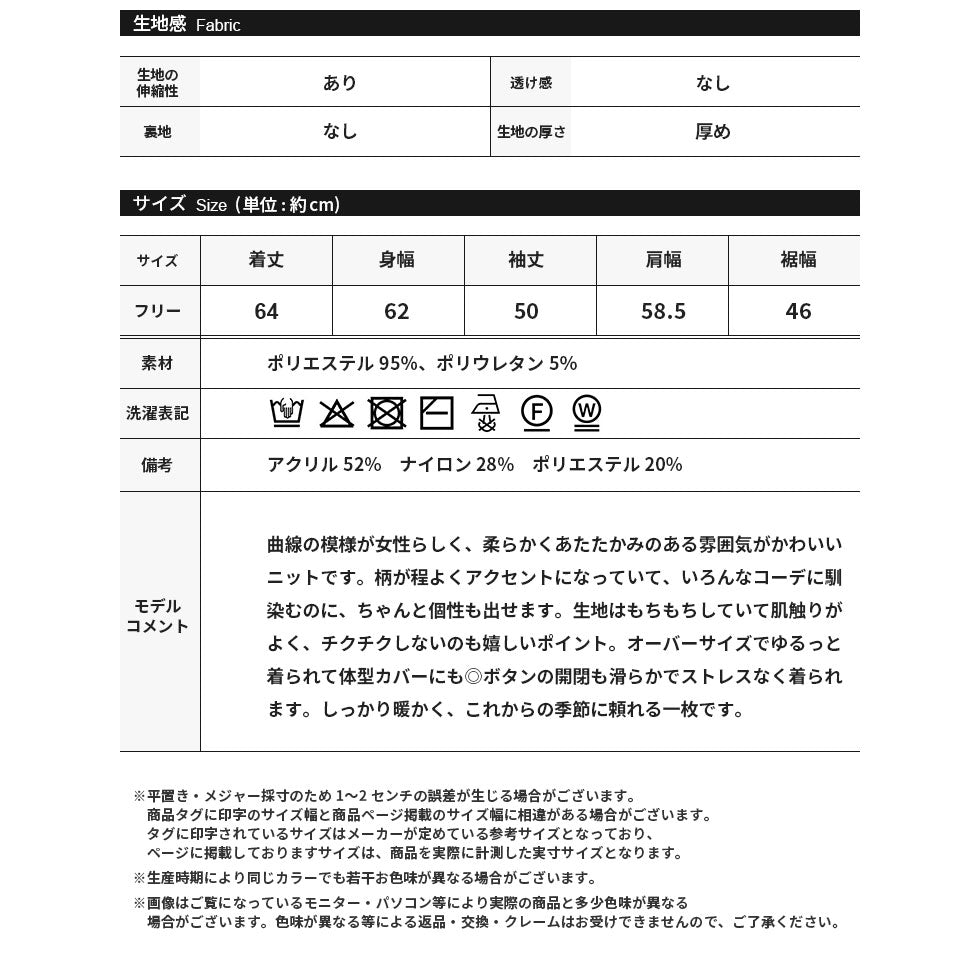 曲線モチーフの柄が女性らしい柔らかさとあたたかみを演出。オーバーサイズのシルエットはゆるっとラフに着られつつ、体型カバーも叶えてくれます。適度な厚みがあり、季節の変わり目はアウターとして、冬はインナーとして活躍する万能な一枚。デザイン性と実用性を両立した仕上がりです。