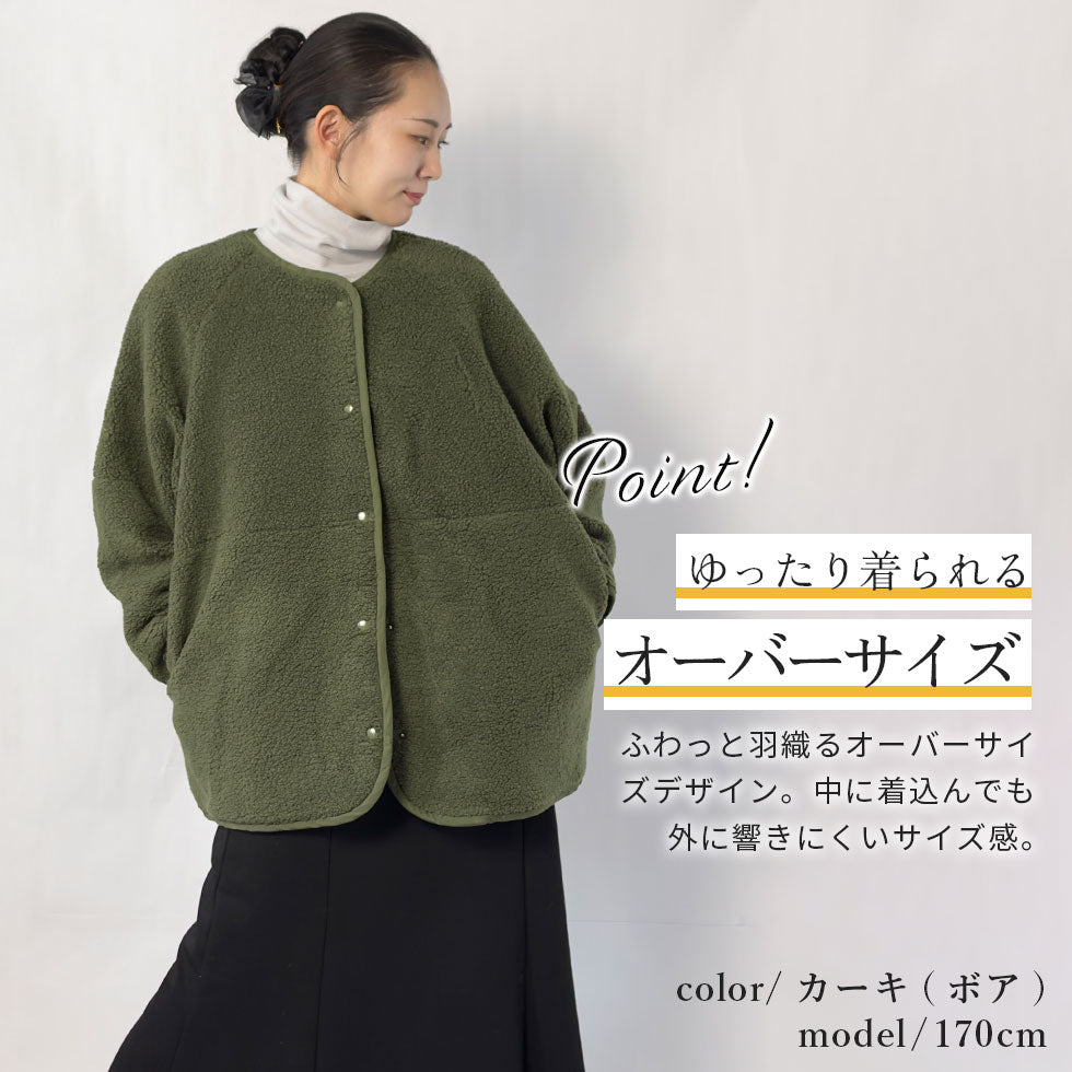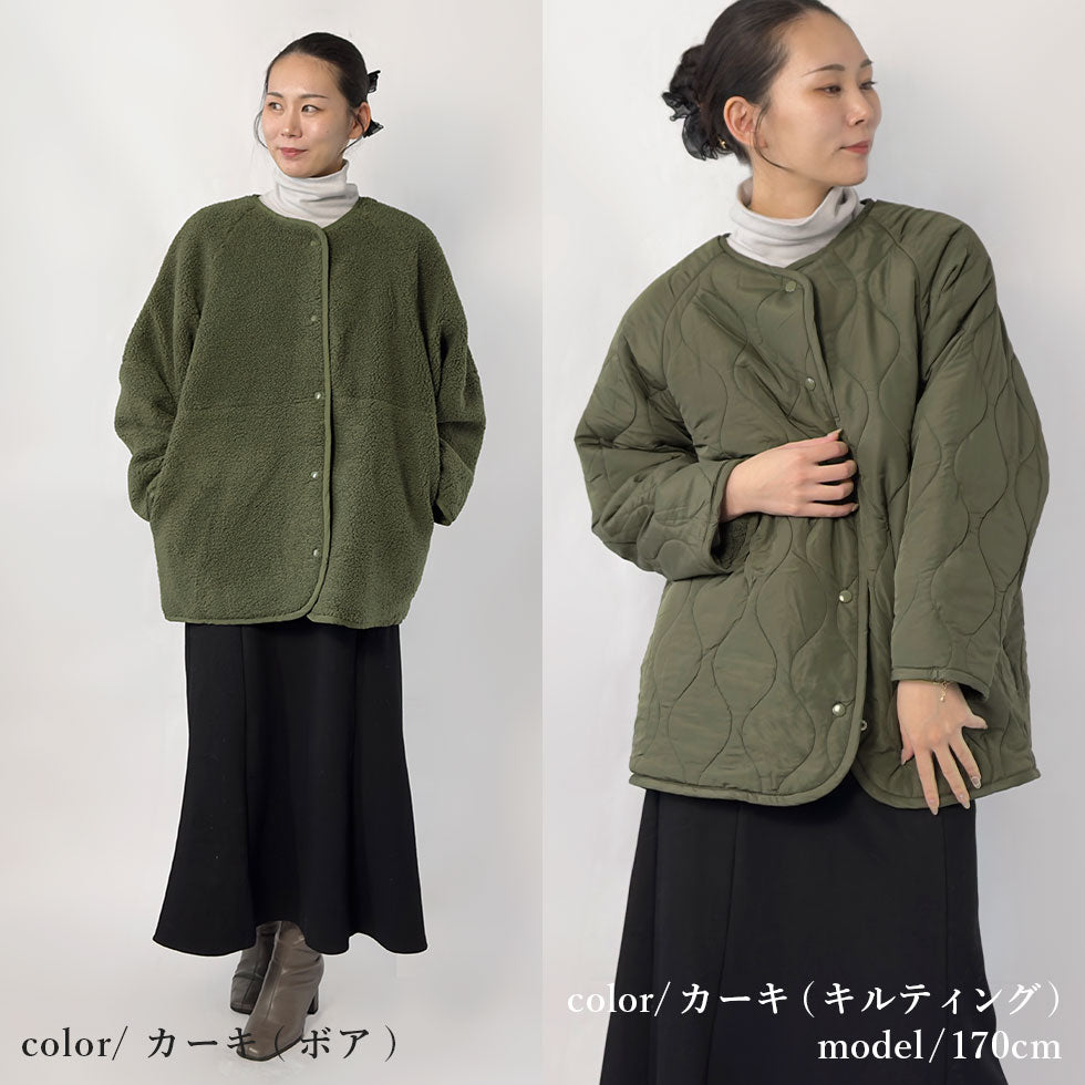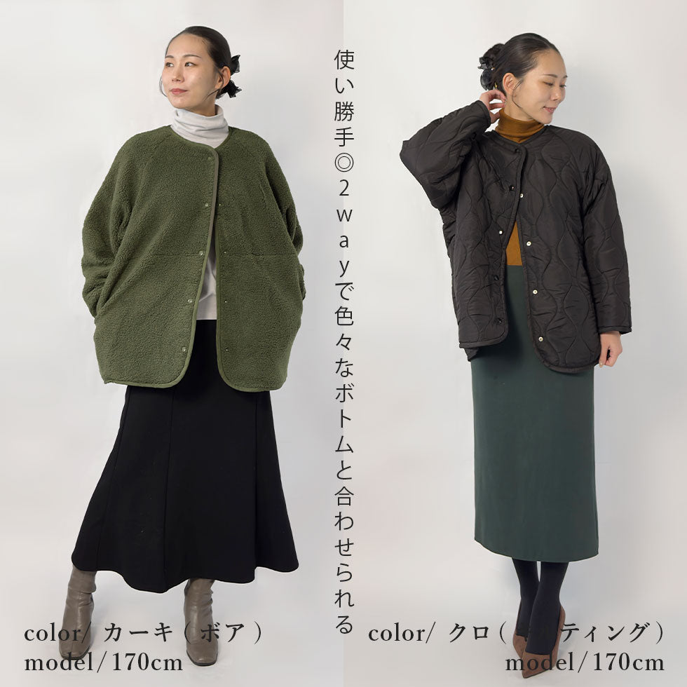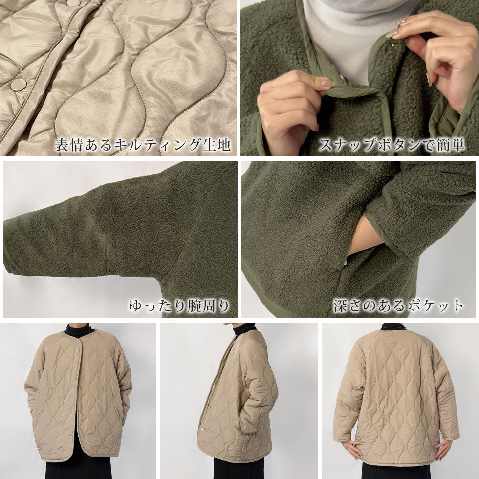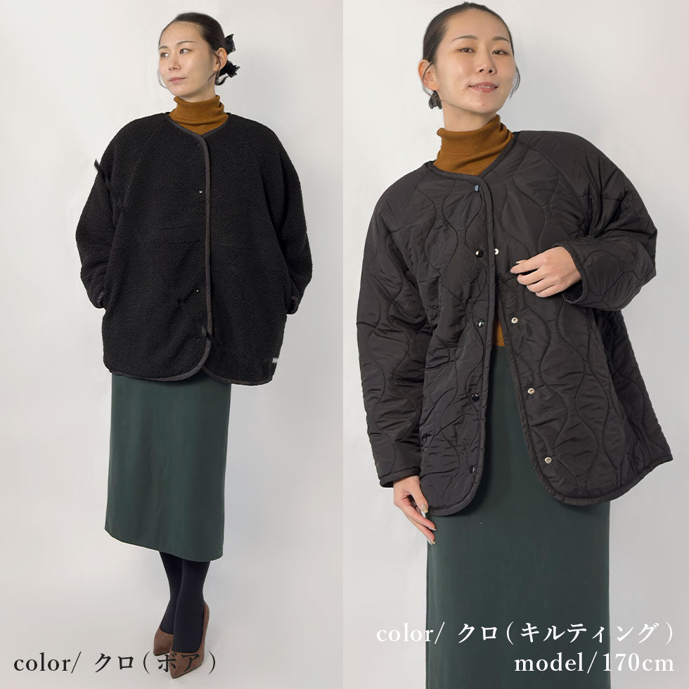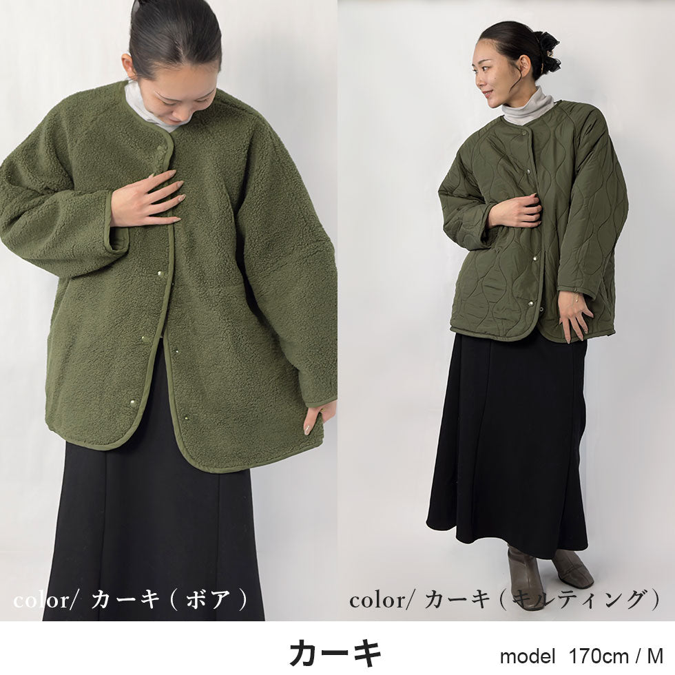 ラグランスリーブ仕様で肩まわりが動かしやすく、丸みのあるシルエットが特徴。重ね着をしてもフォルムが崩れにくく、立体感のある可愛らしいラインをキープします。ノーカラーデザインなので首元がすっきり見え、ハイネックインナーやマフラーとの相性も抜群。ボア面とキルティング面で異なる印象を楽しめるのもポイントです。