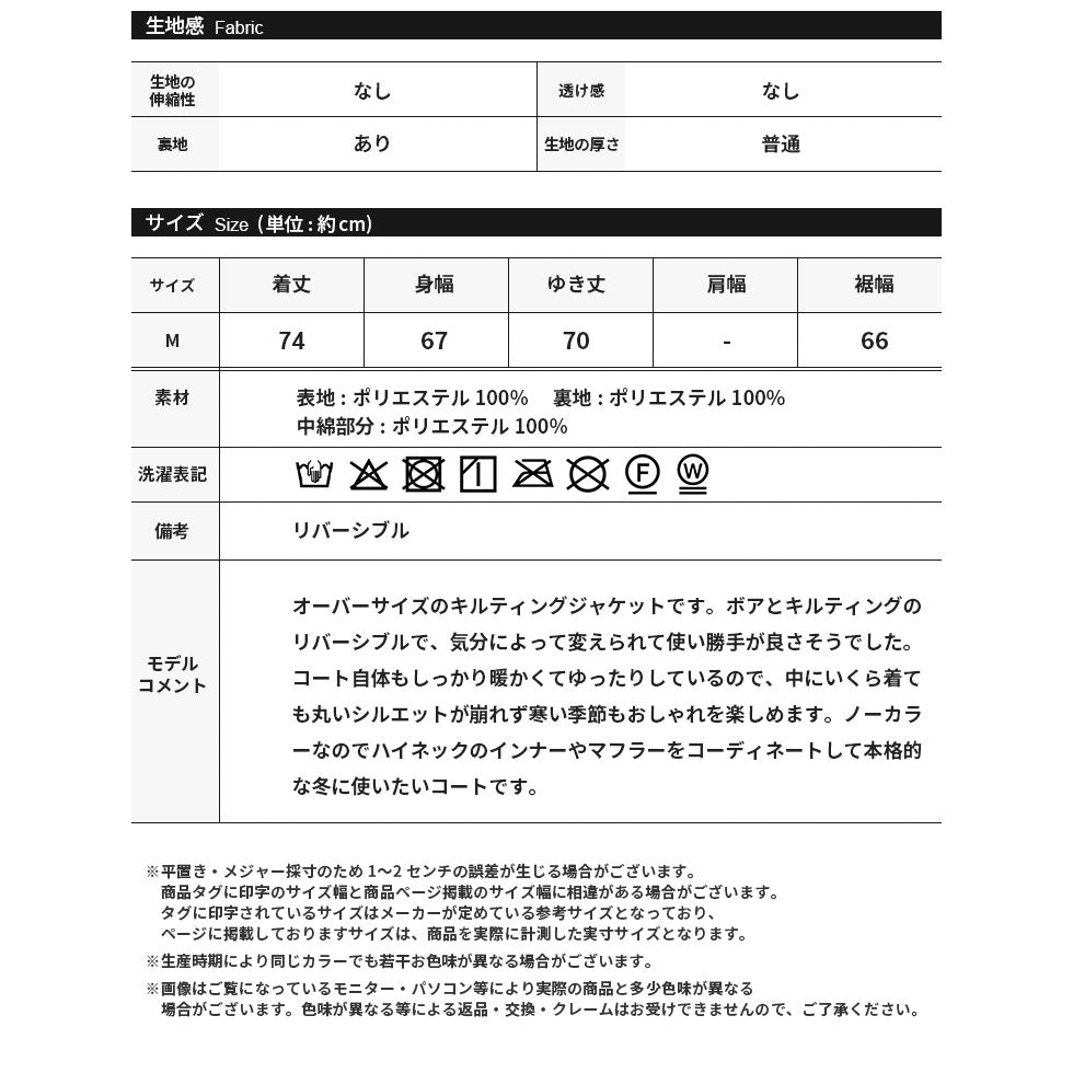 ボアとキルティングの両面を楽しめる、リバーシブル仕様のオーバーサイズコート。その日の気分やコーディネートに合わせて着回せる、使い勝手の良さが魅力です。しっかりとした暖かさがありながら、ゆったりとしたサイズ感で中に重ね着しても窮屈感がなく、寒い季節でも快適に過ごせます。