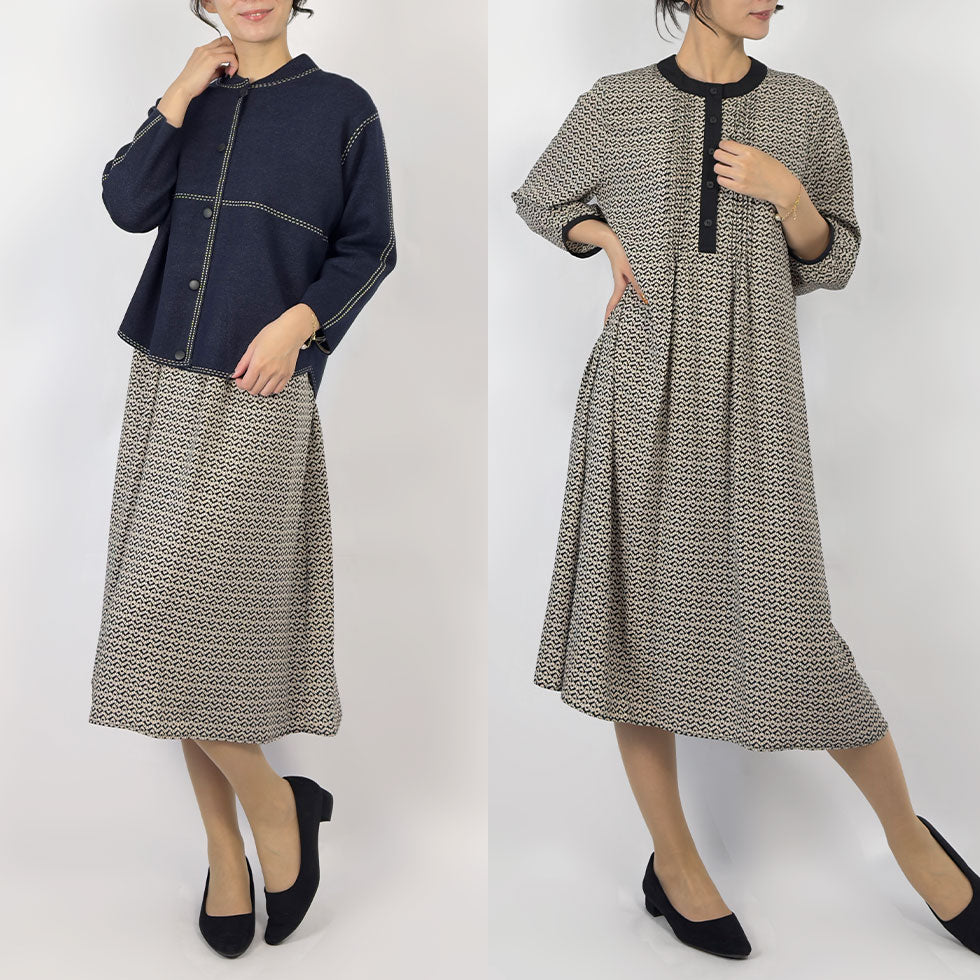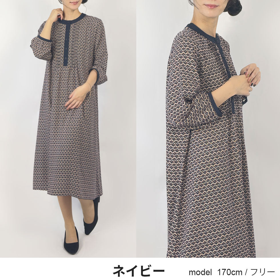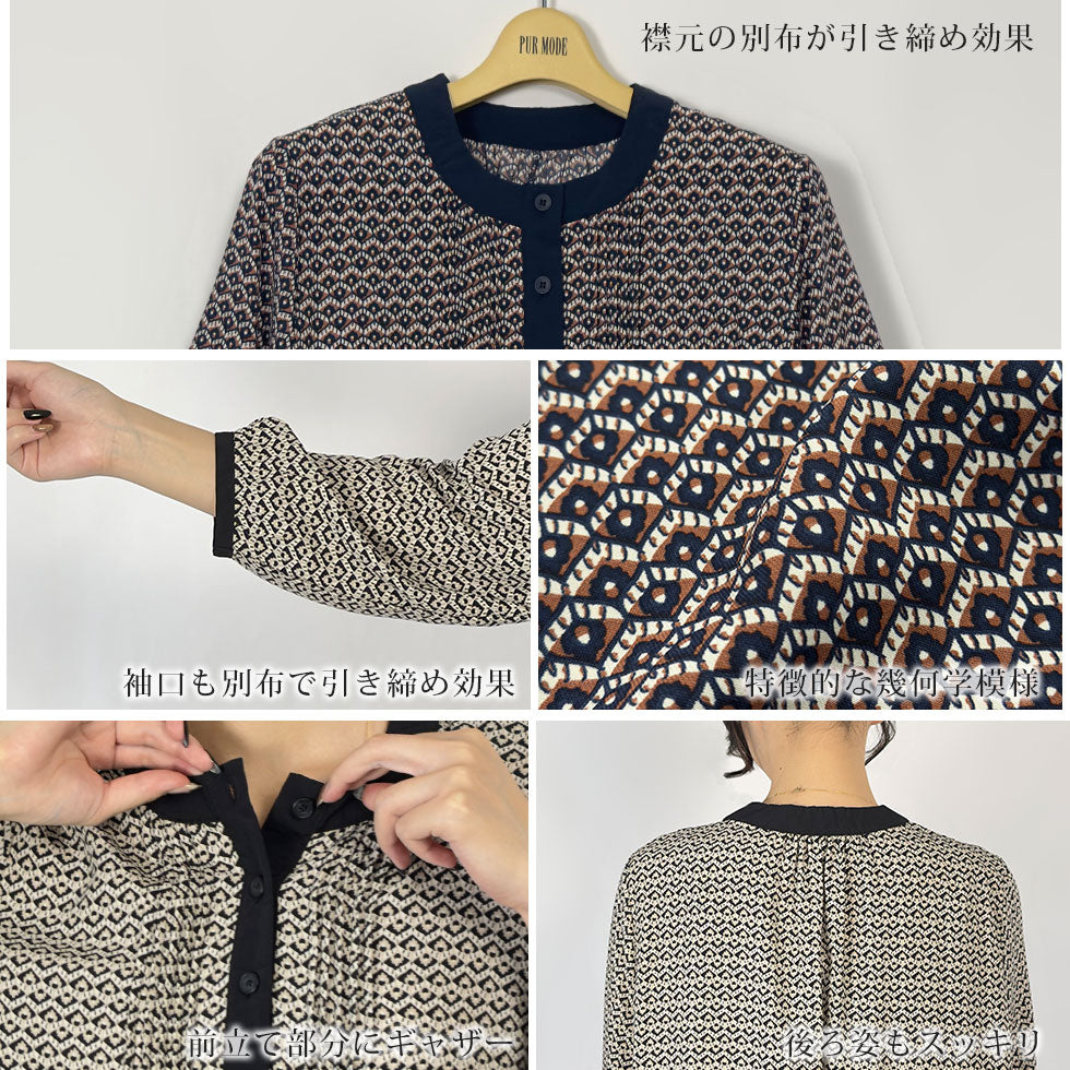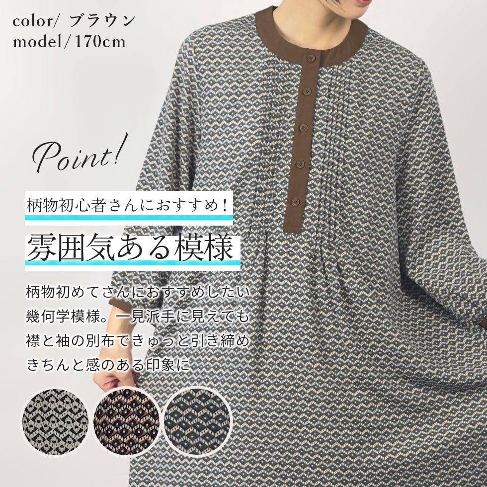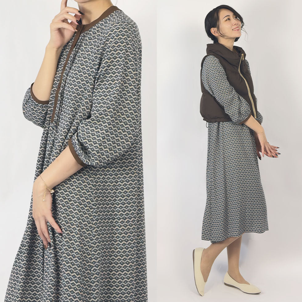 幾何学模様が目を惹く、レトロでおしゃれな印象のワンピースです。襟元の前立て部分には別布とギャザーが寄せられており、さりげない立体感と引き締め効果でスタイルを美しく見せてくれます。