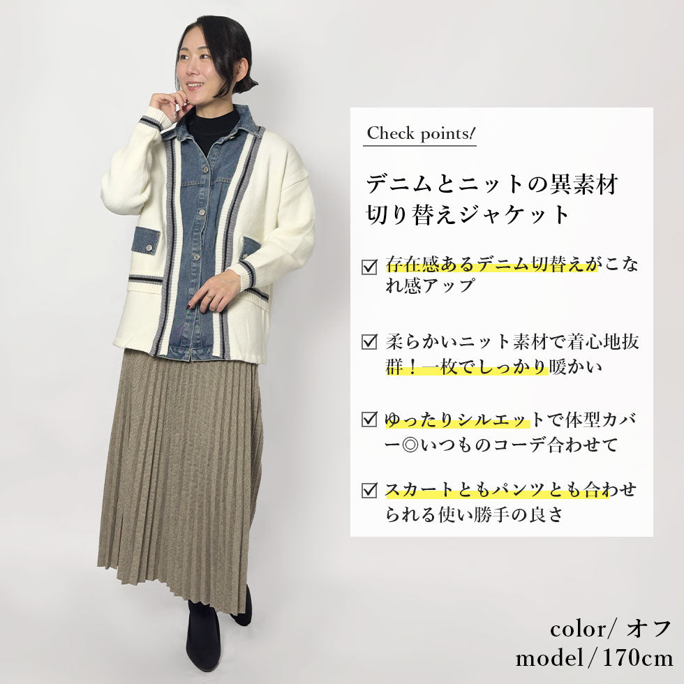 異素材ミックスでこなれ感を演出する、デニム前立てニット切り替えジャケット。