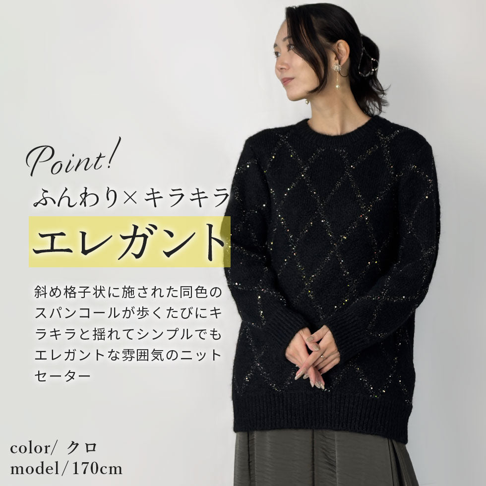さりげない輝きで装いに表情を添える、斜め格子スパンコールニット。