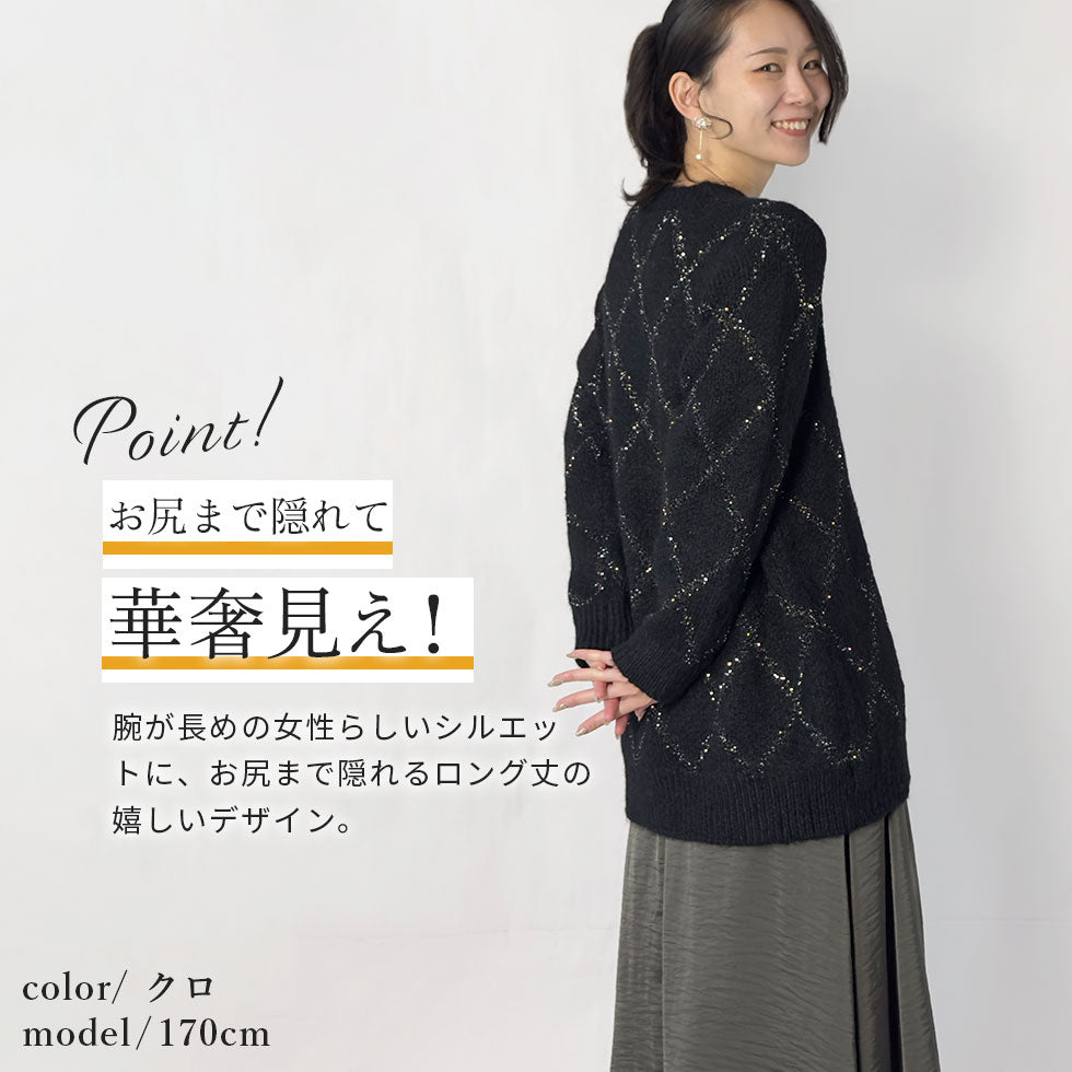 斜めに配置された格子柄が視線を縦に流し、全体のシルエットをすっきりと見せてくれるデザイン。動くたびにスパンコールが控えめにきらっと光り、主張しすぎない華やかさをプラスします。袖はゆったりとしたつくりで、リラックス感がありながらも大人っぽい印象に仕上がっています。