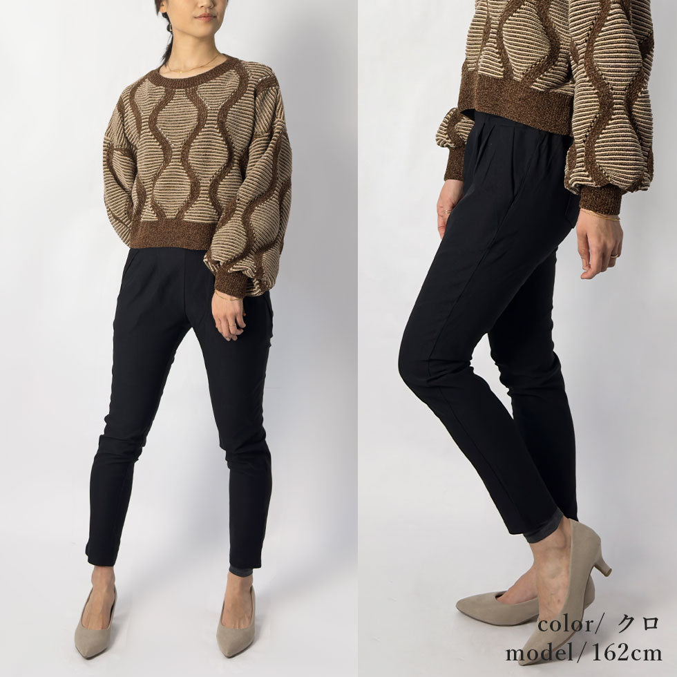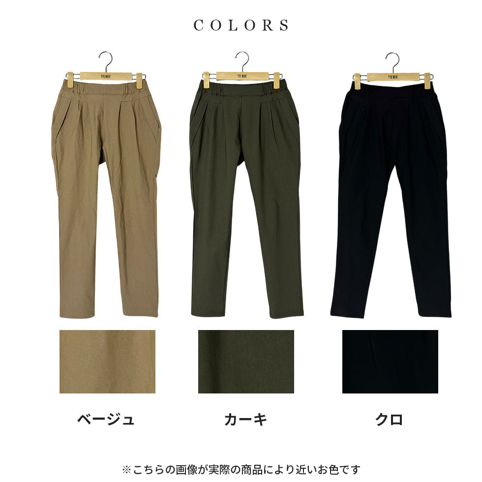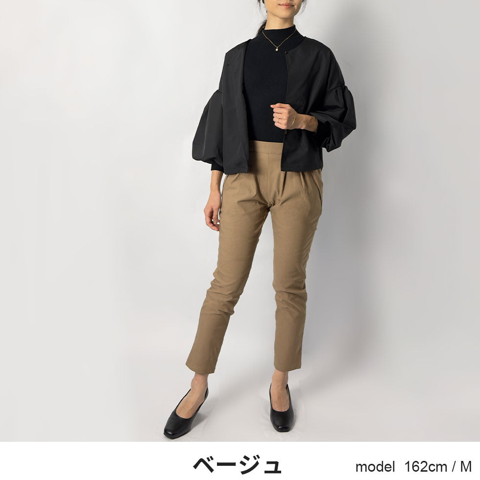 横ポケットやウエストタックなど、さりげないディテールが全体をすっきり綺麗に見せるよう計算されたデザイン。細身ながら身体のラインを拾いすぎず、スタイルアップ効果が期待できます。シンプルでありながら美シルエットが光る、万能なボトムです。