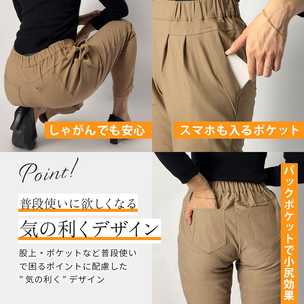 裏起毛でしっかり暖かく、細身シルエットでも窮屈感のないストレッチ素材が魅力のパンツです。足首までふわっと起毛が入り、寒い日でも快適に過ごせる穿き心地。生地の伸びが非常に良く、動きやすさも抜群で、デイリーに活躍する一本です。